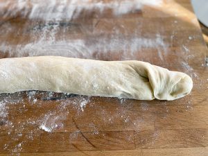Teil den Teig in zwei oder drei Portionen ein, je nachdem wie groß du dein Baguette möchtest. Jede Portion wird nun von der längeren Seite „Stück“ für Stück nach vorne umklappen und unten festdrücken. Und dann noch einmal das ganze wiederholen. Der Teig wird dadurch schon länger und dünner. Nun den Teigstrang nach hinten und nach vorne drehen, um das Baguette zu verlängern. Die Baguette-Teiglinge dürfen noch etwas bemehlt und mit einem Leinentuch abgedeckt für mindestens eine Stunde ruhen. Die Teiglinge brauchen jetzt noch etwas Zeit, damit sich der Teig gut verbindet und an der „Naht“ als schwächste Stelle beim Backen nicht aufplatzt. In der Zeit kann der Backofen mit einem Blech für die Baguettes und einem alten Blech oder feuerfestes Gefäß fürs Bedampfen auf 250° Ober- Unterhitze aufgeheizt werden.