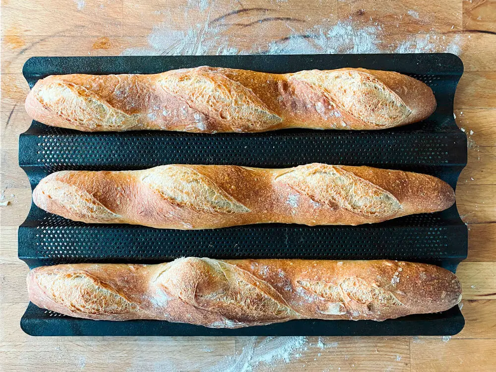 Gerade bei der Herstellung eines Baguettes ist das Backen mit einem Pizza- oder Brotbackstein* und einem Baguette-Backblech* für ein gutes Ergebnis von Vorteil: