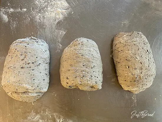 - Teig portionieren: Teig nach der Gehzeit auf eine bemehlte Arbeitsfläche geben und in drei gleichgroße Portionen teilen.